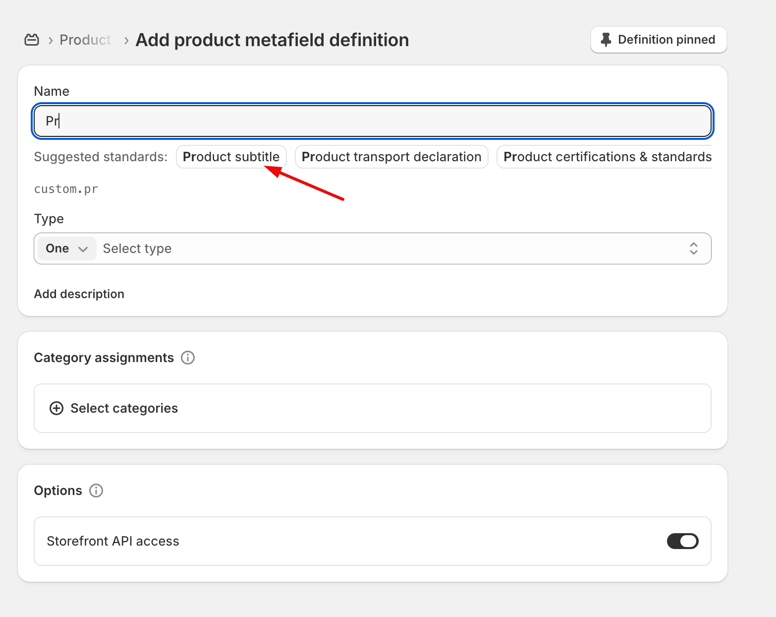 Click on "Add definition". Start typing "Product" in the input field, and you should see an option in "Suggested standards for a "Product subtitle". Select that and hit save. Voila! You have created a product subtitle metafield.